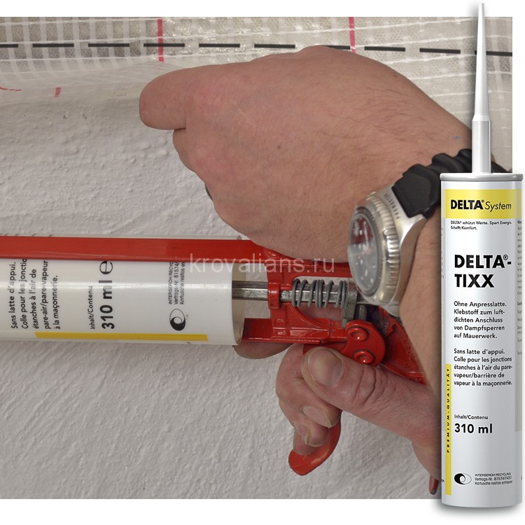 Клей для герметичного и воздухонепроницаемого соединения любой пароизоляционной плёнки DELTA® со стенами, металлическими и деревянными элементами крыши. Не требуется использование прижимной планки. Только для внутреннего применения. Если древесина уже обработана антисептиками/антипиренами, то необходимо предварительно проверить их совместимость с клеем. При монтажных работах и последующей эксплуатации, поверхность основания не должна выделять смол, масел, растворителей или других химически агрессивных веществ. Наносить клей на чистую и обязательно сухую поверхность.